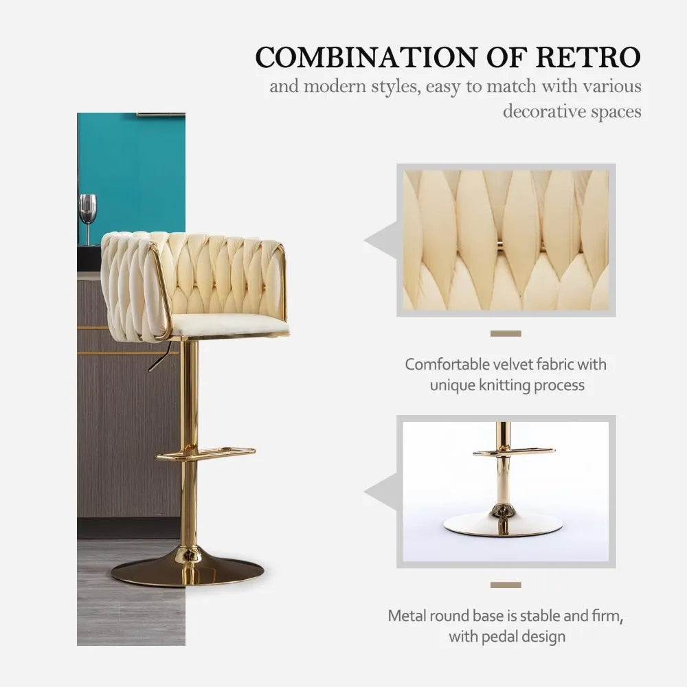 Crafted with a soft velvet upholstery in a sophisticated beige shade, these bar stools are not just comfortable but also stylish. The woven back design adds a touch of artistry, while the robust metal frame ensures durability and stability.