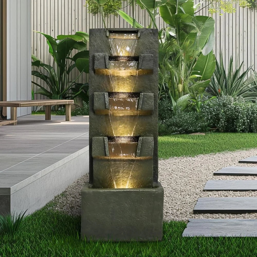 39.3 Inch High Concrete Water Fountain Five Tiers Indoor Outdoor LED Lights Soothing Sound Easy Maintenance Garden Decor