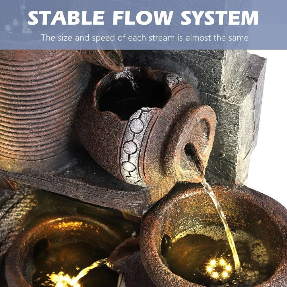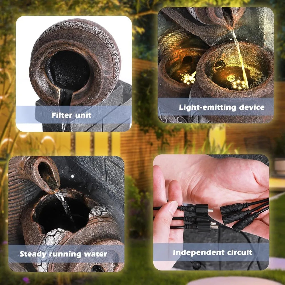 - Unique Design: Our large garden water fountain consists of 6 tiers, forming 5 waterfalls; 3 warm LED lights lit up the fountain appearance, it appears particularly elegant.