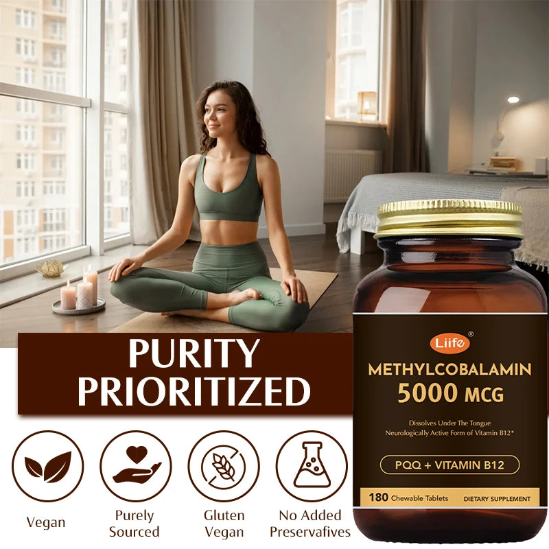 Discover the power of Liife B12 Methylcobalamin 5000mcg, a premium supplement designed to support your energy levels and enhance brain health. These gluten-free, fast-dissolving sublingual tablets are manufactured in the USA, ensuring the highest quality and safety standards.